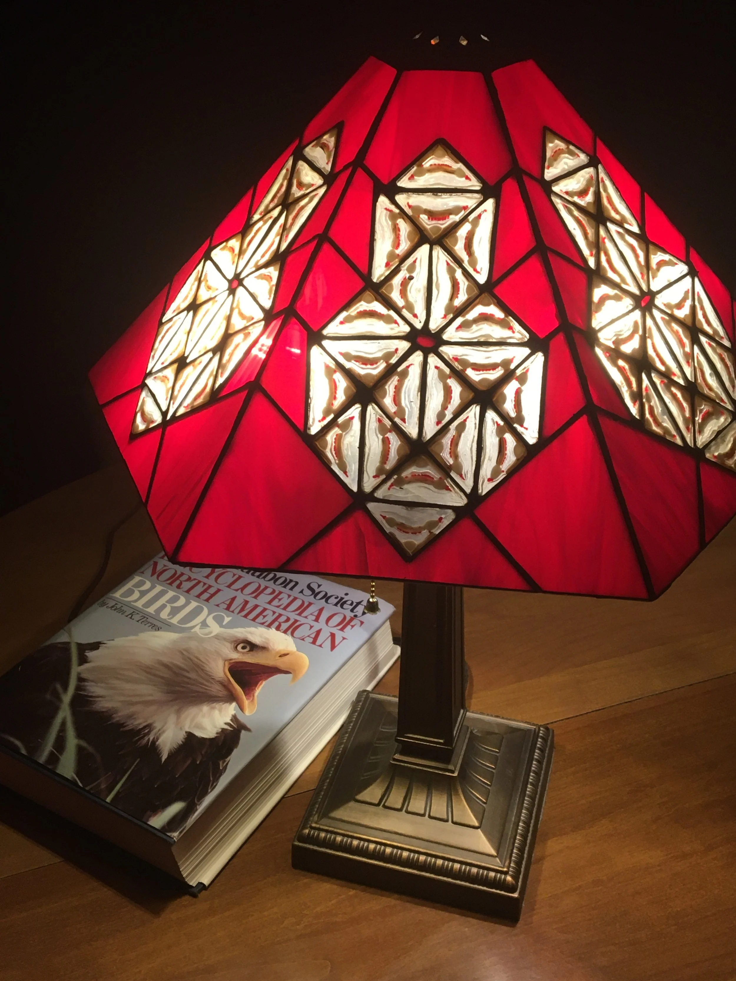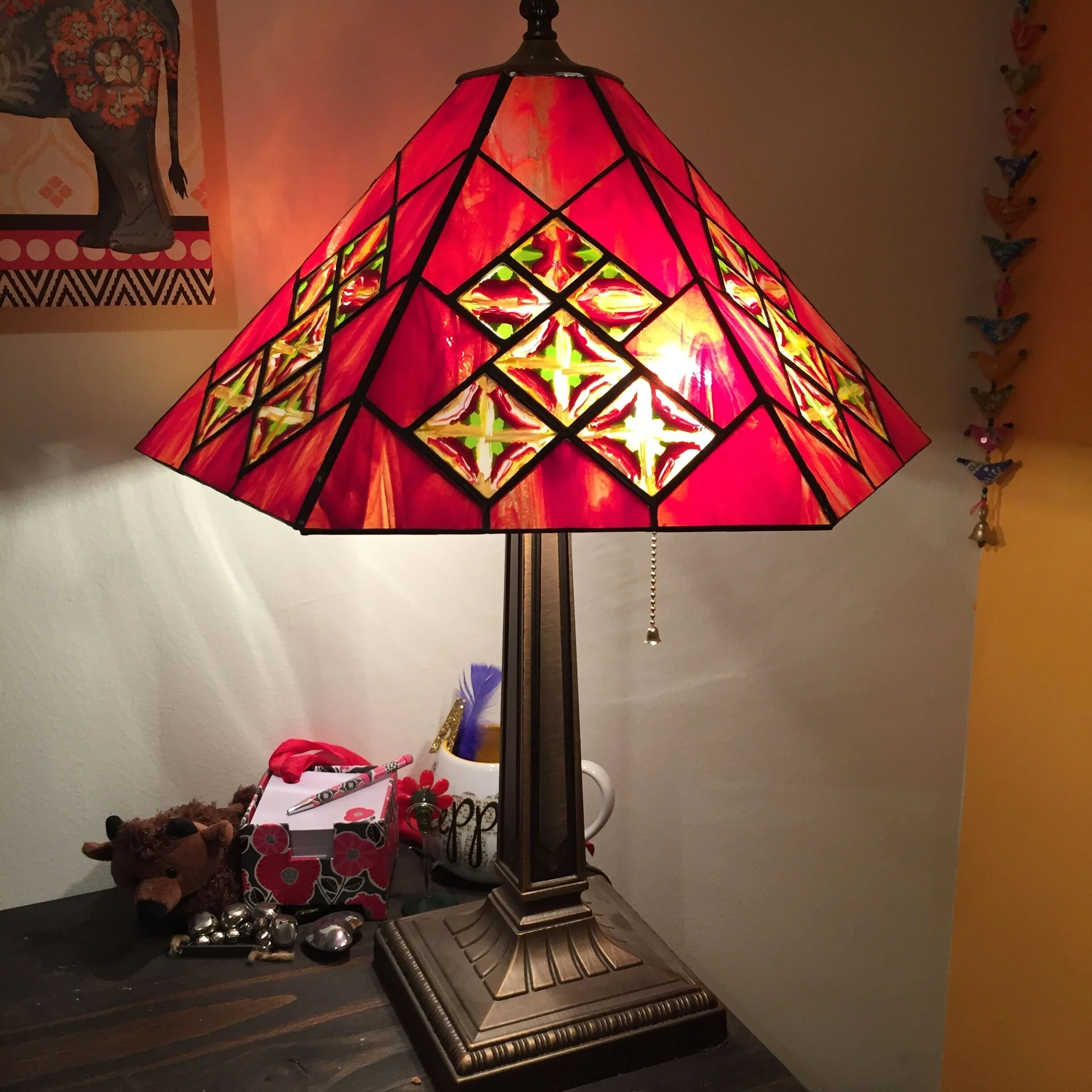 Side panels incorporate fused glass triangles arranged to form the internal design.